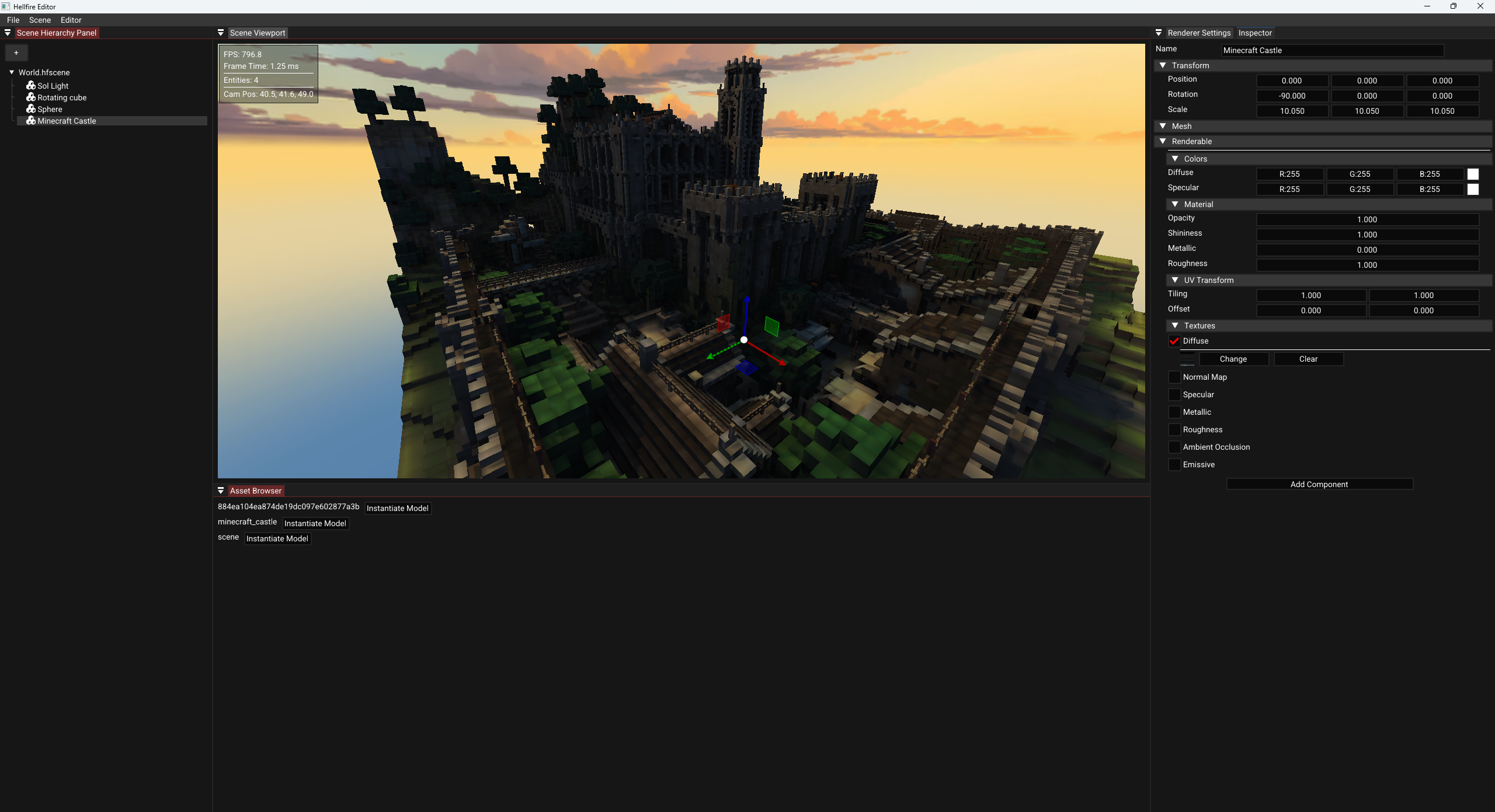Hellfire uses a composition-over-inheritance entity-component system, providing flexibility and maintainability. Entities can be composed of any combination of components at runtime, enabling data-driven scene construction and simplified serialization.